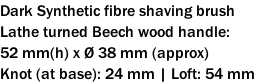 Dark Synthetic fibre shaving brush  Lathe turned Beech wood handle: 52 mm(h) x Ø 38 mm (approx) Knot (at base): 24 mm | Loft: 54 mm 205NAT SD
