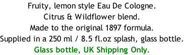 Free postage for any UK order over £45 Culmak Shaving Brush Co. Fruity, lemon style Eau De Cologne. Citrus & Wildflower blend. Made to the original 1897 formula. Supplied in a 250 ml / 8.5 fl.oz splash, glass bottle. Glass bottle, UK Shipping Only.