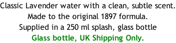 Free postage for any UK order over £45 Culmak Shaving Brush Co. Classic Lavender water with a clean, subtle scent. Made to the original 1897 formula. Supplied in a 250 ml splash, glass bottle Glass bottle, UK Shipping Only.