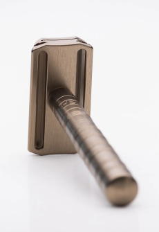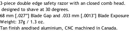 Henson Shaving AL13 TAN + 3-piece double edge safety razor with an closed comb head.  designed to shave at 30 degrees. 68 mm [.027”] Blade Gap and .033 mm [.0013"] Blade Exposure Weight: 37g / 1.3 oz. Tan finish anodised aluminium, CNC machined in Canada. £75.00 (ex.VAT 62.50)