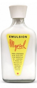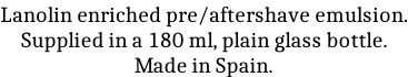 Emulsion Myrsol Lanolin enriched pre/aftershave emulsion. Supplied in a 180 ml, plain glass bottle. Made in Spain. £20.40 (ex.VAT 17.00)
