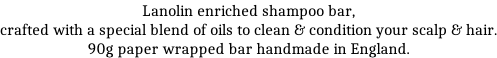 Free postage for any UK order over £45 Edwin Jagger DESSKNBL 3ONE6 Stainless Safety Razor Lanolin enriched shampoo bar, crafted with a special blend of oils to clean & condition your scalp & hair. 90g paper wrapped bar handmade in England. Lanolin Shampoo Bar £6.30 (ex.VAT 5.25)