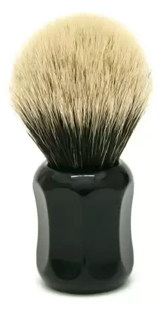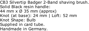 CB3 Silvertip Badger 2-Band shaving brush. Solid Black resin handle: 44 mm x Ø 35 mm (approx) Knot (at base): 24 mm | Loft: 52 mm Knot Shape: Bulb Supplied in card tube. Handmade in Germany. 173-040