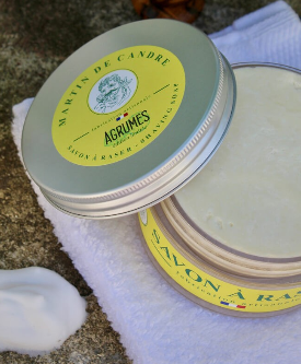Martin De Candre Agrumes Shaving Soap Shaving soap with a Stearate & Coconut oil base. 200g supplied in a PETG Jar & carton. Handmade in France. £48.00  (ex.VAT 40.00)